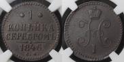 В таблице показаны цены на царскую монету 1 копейка 1846 года СМ выполненной из меди. Продажи фиксируются на публичных нумизматических аукционах всего мира. Стоимость продажи указана без учета комиссионного вознаграждения аукциона.