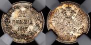В таблице показаны цены на царскую монету 25 пенни 1917 года S выполненной из серебра. Орел с тремя коронами. Продажи фиксируются на публичных нумизматических аукционах всего мира. Стоимость продажи указана без учета комиссионного вознаграждения аукциона.