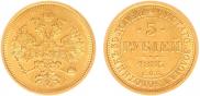 В таблице показаны цены на царскую монету 5 рублей 1885 года СПБ-АГ выполненной из золота. Продажи фиксируются на публичных нумизматических аукционах всего мира. Стоимость продажи указана без учета комиссионного вознаграждения аукциона.