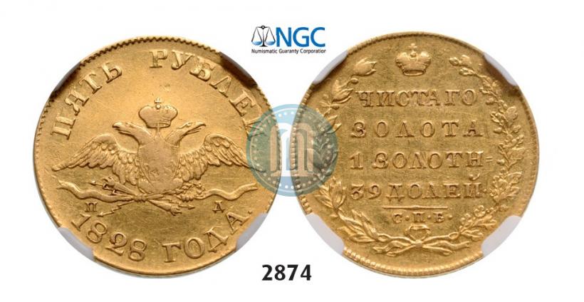 5 рублей 1828 года СПБ-ПД . Золото. Гурт пунктир. Конрос # 16/11