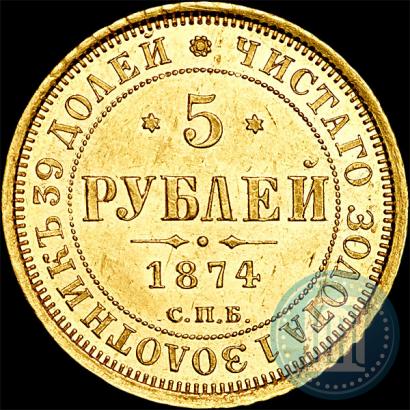 5 рублей 1874 года СПБ-НІ . Золото. Гурт пунктир. Конрос # 18/18