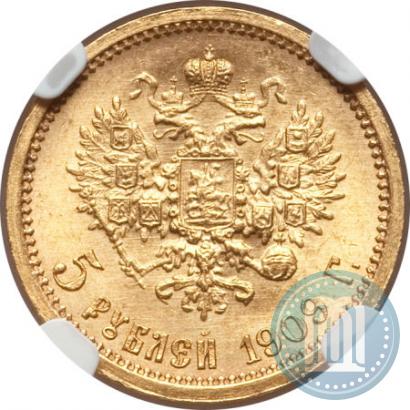 5 рублей 1909 года (ЭБ) . Золото. Гурт узорчатый. Биткин # 34 (R), Конрос # 20/17