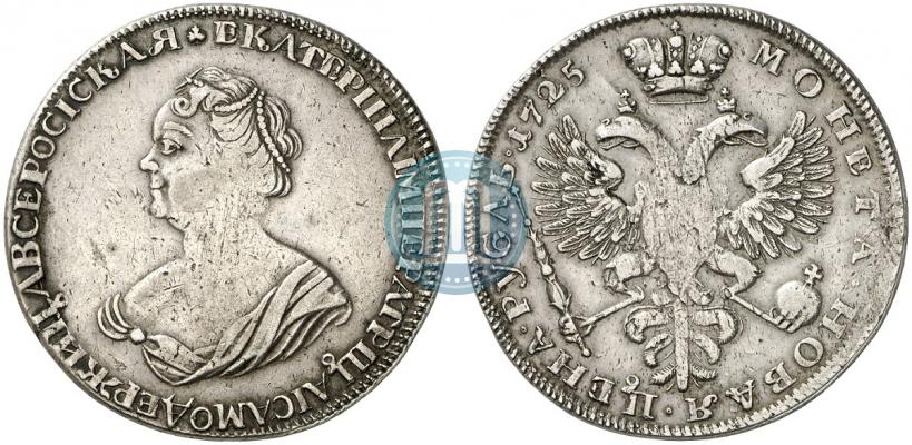 1 рубль 1725 года "Траурный". Над головой трилистник. Серебро. Гурт шнур влево. Биткин # 67 (R2), Петров - 15 руб., Ильин - 30 руб., Конрос # 49/1