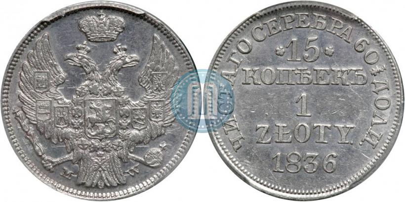 Фото 15 копеек - 1 злотый 1836 года MW