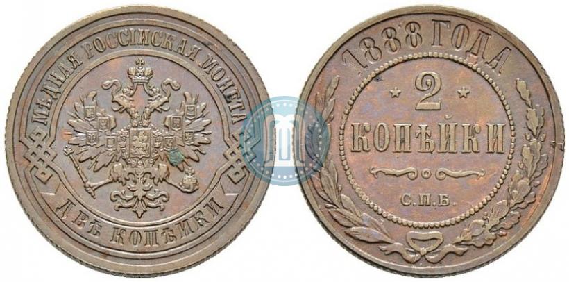 2 копейки 1888 года СПБ . Медь. Гурт рубчатый. Конрос # 202/28