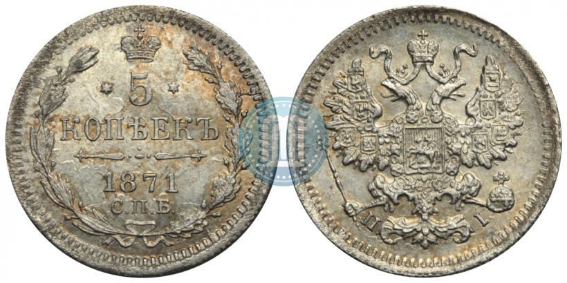 5 копеек 1871 года СПБ-HI . Серебро. Гурт рубчатый. Конрос # 170/34