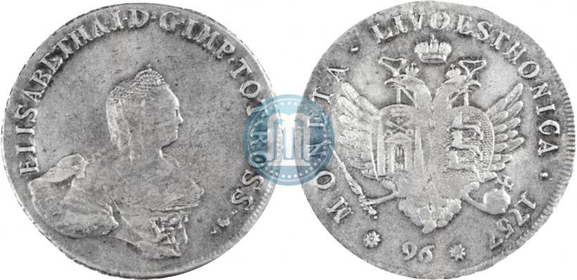 96 копеек 1757 года "Ливонез". Серебро. Гурт узорчатый. Биткин # 627 (R), Петров - 6 руб., Ильин - 6 руб., Конрос # 410/3