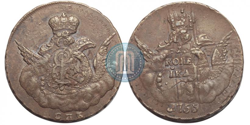 1 копейка 1755 года СПБ . Медь. Гурт сетчатый. Биткин # 532 (R), Петров - 1 руб., Конрос # 206/3