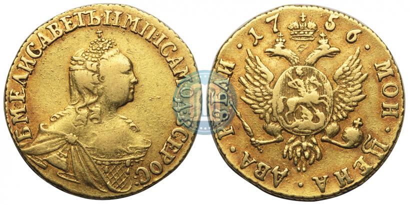2 рубля 1756 года . Золото. Гурт шнур вправо. Биткин # 50 (R), Петров - 6 руб., Конрос # 34/1