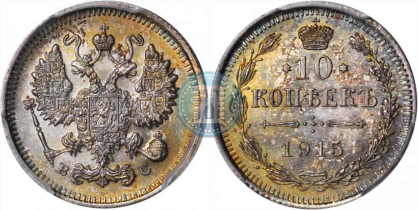 10 копеек 1915 года ВС . Серебро. Гурт рубчатый. Конрос # 162/94