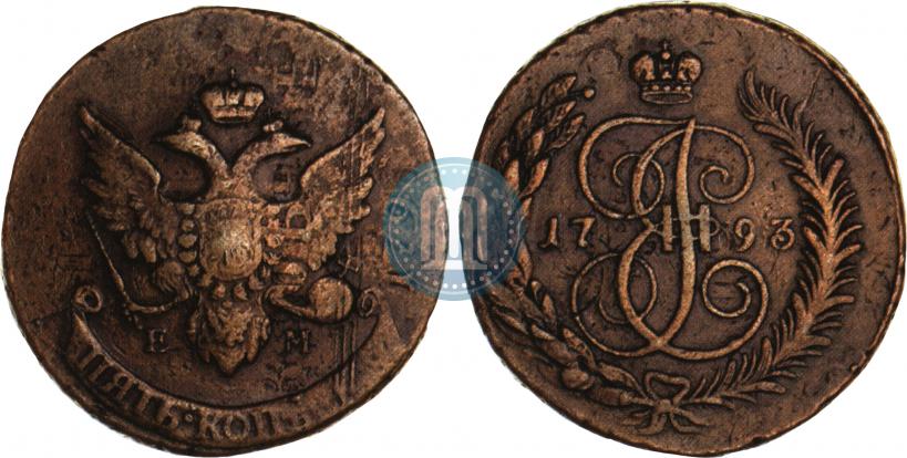 5 копеек 1793 года ЕМ "Павловский перечекан". Медь. Гурт сетчатый. Петров - нет руб., Конрос # 180/194 180/195