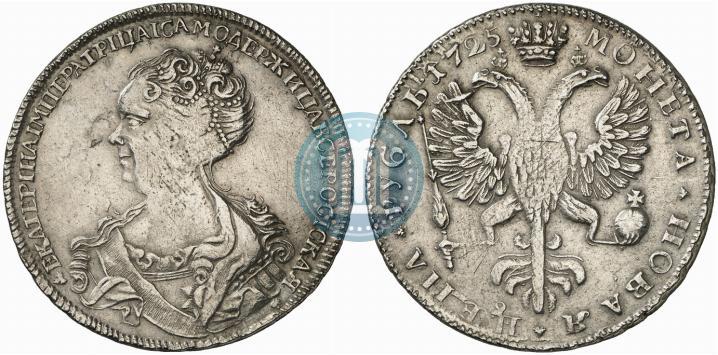 1 рубль 1725 года "Петербургский тип, портрет влево". Хвост орла широкий. Серебро. Гурт узорчатый. Петров - 5-10 руб., Ильин - 3-5 руб., Конрос # 50/11 50/12 50/13