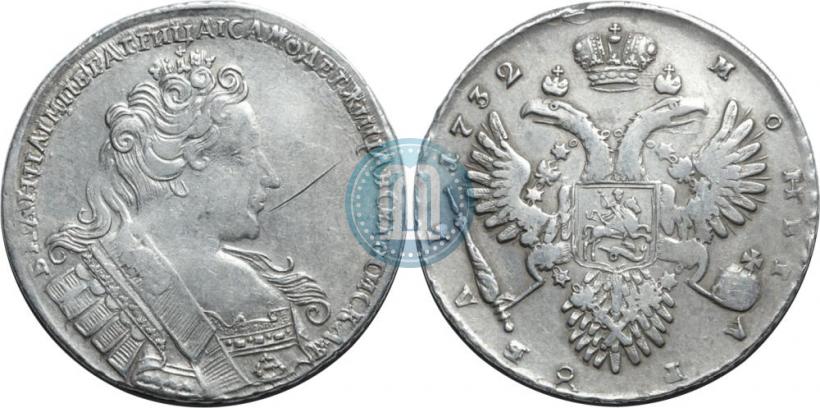 1 рубль 1732 года . Крест державы простой. Серебро. Гурт узорчатый. Петров - нет руб., Ильин - нет руб., Конрос # 56/14