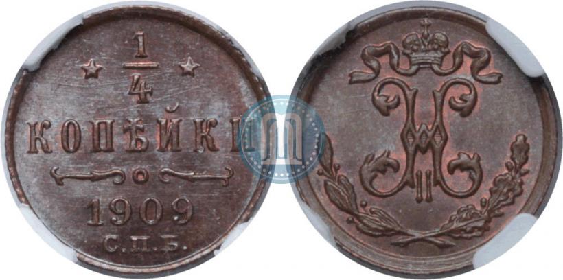 1/4 копейки 1909 года СПБ . Медь. Гурт рубчатый. Конрос # 243/57