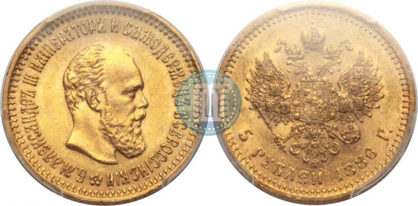 5 рублей 1886 года (АГ) . Портрет с длинной бородой. Золото. Гурт надпись. Конрос # 19/1