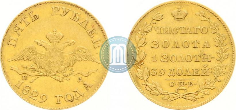 5 рублей 1829 года СПБ-ПД . Золото. Гурт пунктир. Ильин - 20 руб., Конрос # 16/12