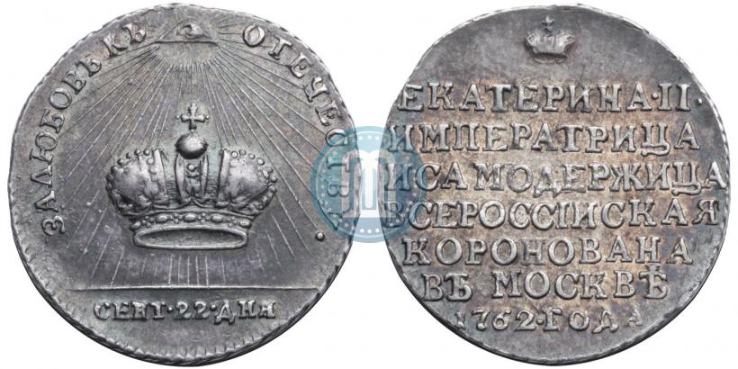 Жетон 1762 года "Коронация Императрицы Екатерины II". Серебро. Гурт шнур влево. Биткин # 1357 (R)