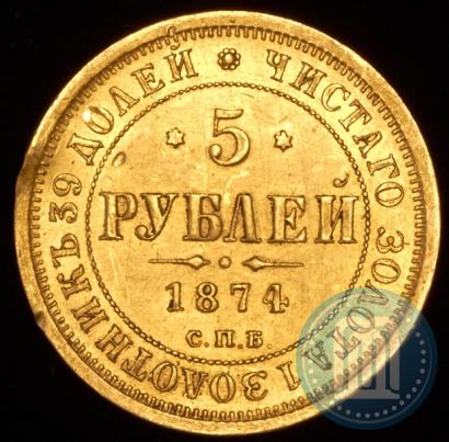 5 рублей 1874 года СПБ-НІ . Золото. Гурт пунктир. Конрос # 18/18