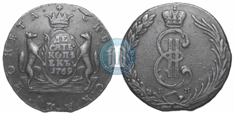 10 копеек 1769 года КМ . Медь. Гурт шнур влево. Петров - 0,75 руб., Конрос # 174/6