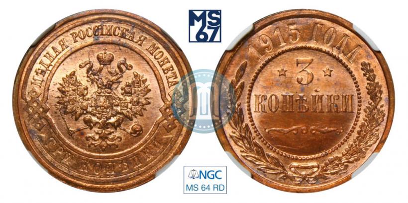3 копейки 1915 года . Медь. Гурт рубчатый. Конрос # 190/49