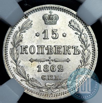 15 копеек 1862 года СПБ-МИ . Серебро. Гурт пунктир. Конрос # 149/15