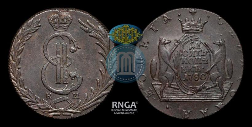 10 копеек 1780 года КМ . Медь. Гурт шнур влево. Петров - 1 руб., Конрос # 174/18