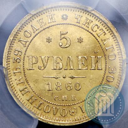 5 рублей 1860 года СПБ-ПФ . Золото. Гурт пунктир. Конрос # 18/2