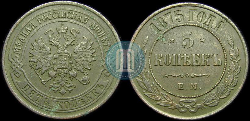 5 копеек 1875 года ЕМ . Медь. Гурт рубчатый. Конрос # 185/14