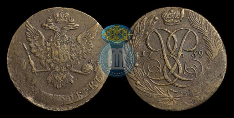 5 копеек 1759 года . Медь. Гурт сетчатый. Конрос # 178/4
