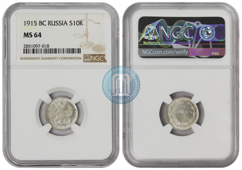 10 копеек 1915 года ВС . Серебро. Гурт рубчатый. Конрос # 162/94