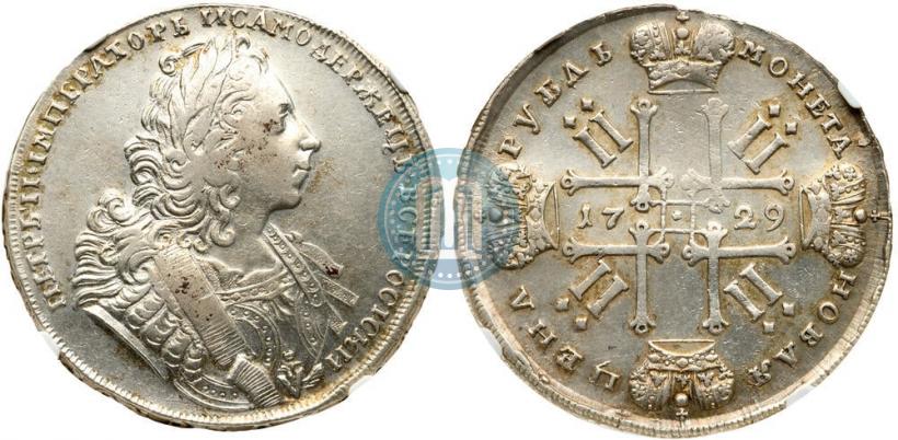 1 рубль 1729 года "Тип 1729". Без заклепок над обрезом рукава. Серебро. Гурт надпись. Петров - 2,5 руб., Ильин - нет руб., Конрос # 54/1 54/2 54/5 54/6 54/7