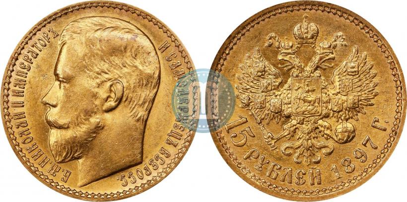 15 рублей 1897 года (АГ) . Три последние буквы заходят за обрез шеи. Золото. Гурт надпись. Петров - нет руб., Ильин - нет руб., Конрос # 1/2 1/3