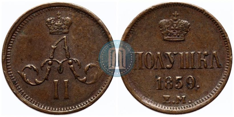 Полушка 1859 года ЕМ . Короны малые. Медь. Гурт гладкий. Ильин - 1 руб., Конрос # 242/27