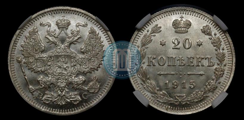 20 копеек 1915 года ВС . Серебро. Гурт рубчатый. Конрос # 146/92