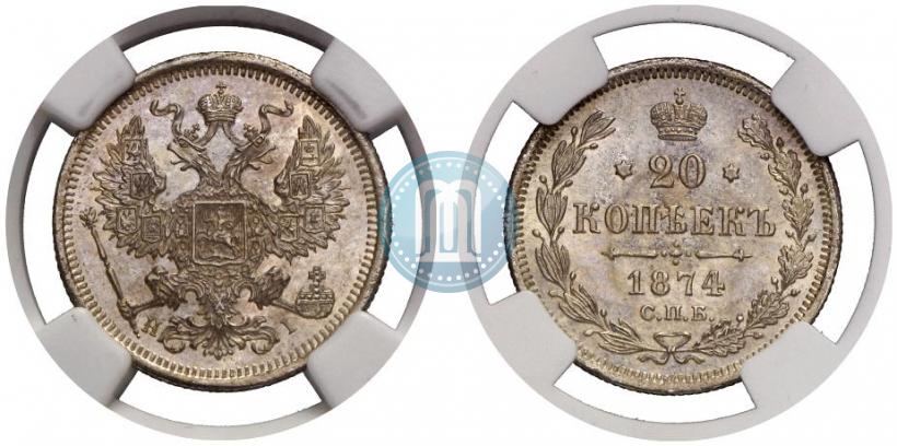 20 копеек 1874 года СПБ-HI . Серебро. Гурт рубчатый. Конрос # 146/53
