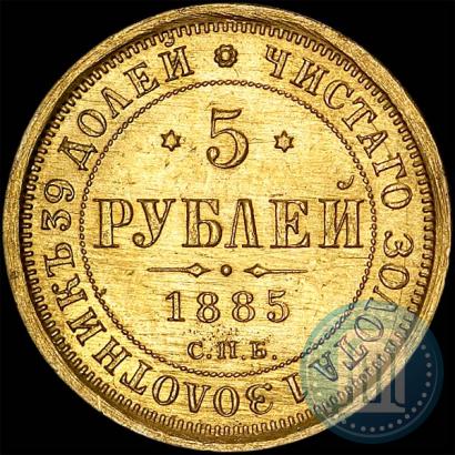 5 рублей 1885 года СПБ-АГ . Золото. Гурт пунктир. Конрос # 18/33