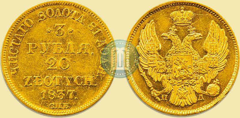 Цена 3 рубля - 20 злотых 1837 года СПБ-ПД