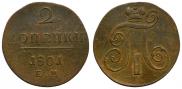 Согласно аукционным продажам, средняя цена данной павловской монеты на 21 декабря 2025 составляет - 11000 рублей для регулярного чекана. Самый дорогой экземпляр, выставлялся 12 октября 2012 года в Цюрихе на швейцарском аукционе Sincona AG, лот номер 610. На торгах стоимость достигла 1500 швейцарских франков. Для медных 2 копеек 1801 года с буквами ЕМ - это является самой высокой ценой на сегодняшний день.