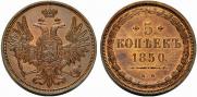 Согласно аукционным продажам, средняя цена данной монеты на 20 декабря 2025 составляет - 170000 рублей для регулярного чекана. Самый дорогой экземпляр, выставлялся 15 марта 2008 года в Москве на российском аукционе Монеты и Медали, лот номер 454. На торгах стоимость достигла 260000 российских рублей. Для медных 5 копеек 1850 года с буквами ЕМ - это является самой высокой ценой на сегодняшний день.