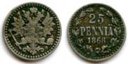 Согласно аукционным продажам, средняя цена данной монеты на 19 декабря 2025 составляет - 21000 рублей для регулярного чекана. Самый дорогой экземпляр, выставлялся 14 апреля 2007 года в Москве на российском аукционе Монеты и Медали, лот номер 350. На торгах стоимость достигла 260000 российских рублей. Для серебряных 25 пенни 1868 года с буквами S - это является самой высокой ценой на сегодняшний день.