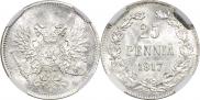 В таблице показаны цены на царскую монету 25 пенни 1917 года S выполненной из серебра. Орел без корон. Продажи фиксируются на публичных нумизматических аукционах всего мира. Стоимость продажи указана без учета комиссионного вознаграждения аукциона.