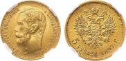 В таблице показаны цены на царскую монету 5 рублей 1897 года (АГ) выполненной из золота. Продажи фиксируются на публичных нумизматических аукционах всего мира. Стоимость продажи указана без учета комиссионного вознаграждения аукциона.