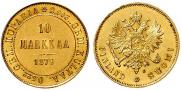 Согласно аукционным продажам, средняя цена данной монеты на 25 декабря 2025 составляет - 50000 рублей для регулярного чекана. Самый дорогой экземпляр, выставлялся 09 марта 2024 года в Хельсинки на финском аукционе HOLMASTO, лот номер 387. На торгах стоимость достигла 11500 евро. Для золотых 10 марок 1879 года с буквами S - это является самой высокой ценой на сегодняшний день.
