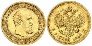 Монета 5 рублей 1889 года (АГ) чеканилась на Санкт-Петербургском монетном дворе во времена Александра III. Гуртовое оформление в виде надписи. Монета маленького размера имеет диаметр 21,3 мм, вес 6,45 гр, выполнена из золота 900 пробы. Руководителем монетного двора был Аполлон Грасгоф, о чем свидетельствует знак минцмейстера АГ. Это самые распространенные 5 рублей данного типа, средняя стоимость на аукционах составляет 32000 рублей.