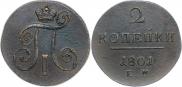 Согласно аукционным продажам, средняя цена данной павловской монеты на 21 декабря 2025 составляет - 11000 рублей для регулярного чекана. Самый дорогой экземпляр, выставлялся 12 октября 2012 года в Цюрихе на швейцарском аукционе Sincona AG, лот номер 610. На торгах стоимость достигла 1500 швейцарских франков. Для медных 2 копеек 1801 года с буквами ЕМ - это является самой высокой ценой на сегодняшний день.