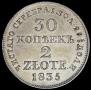 Согласно аукционным продажам, средняя цена данной монеты на 25 декабря 2025 составляет - 26000 рублей для регулярного чекана. Самый дорогой экземпляр, выставлялся 21 сентября 2024 года в Варшаве на польском аукционе Antykwariat Numizmatyczny - Michal Niemczyk, лот номер 280. На торгах стоимость достигла 14000 польских злотых. Для серебряных 30 копеек - 2 злотых 1835 года с буквами MW - это является самой высокой ценой на сегодняшний день.