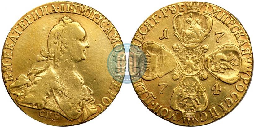 10 roubles 1774 year СПБ . Gold. Edge cordlike leftwards. Bitkin # 29 (R), Petrov - 22 rub., Ilyin - 20 rub., Conros # 4/21