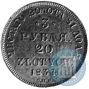 3 roubles - 20 złotych 1834 year СПБ-ПД . Gold. Edge dotted. Bitkin # 1075 (R), Petrov - 5,5 rub., Conros # 470/1