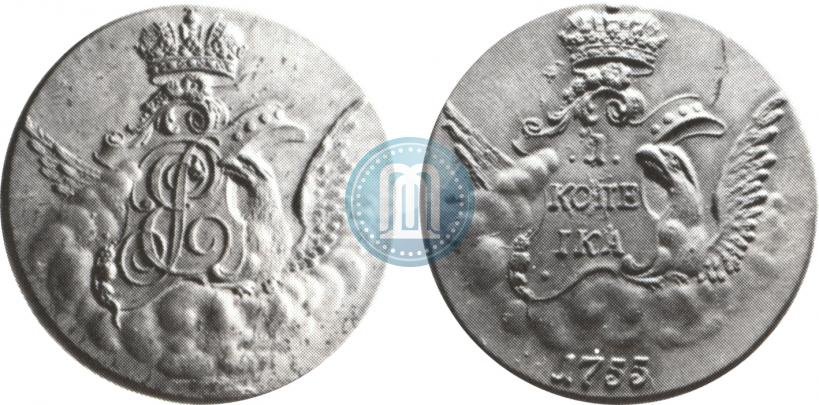 1 kopeck 1755 year . Restrike. Copper. . Bitkin # 425 (R2)