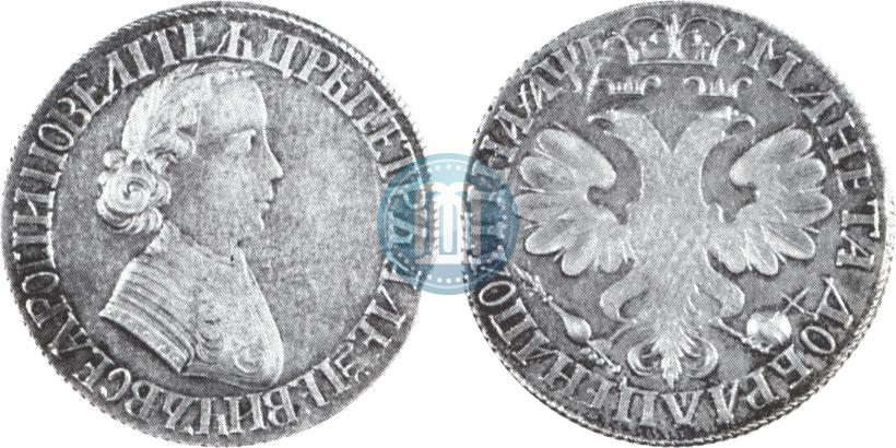 Poltina 1705 year "Portrait by F. Alekseev". Two curl at laurel wreath. Silver. Edge plain. Bitkin # 552 (R3)